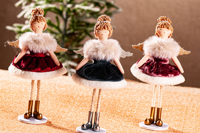 Tři panenky v barevných sametových šatečkách. Jedna panenka má červené šaty, druhá tmavě modré a třetí růžové. Panenky mají křidélka, jsou to takoví milí andílci s drdůlkem svázaným perličkami. Andílci jsou vysocí 18 cm a pomohou nám zkrášlit vánoční čas.