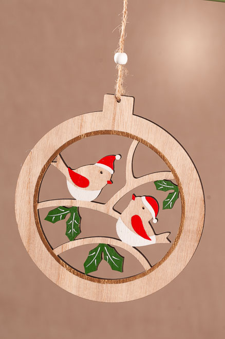 Dřevěná baňka na zavěšení na větvičku. Baňka má průměr 16 cm. Zobrazuje dva ptáčky v červených čepičkách. Pěkná zimní dekorace, kterou si můžete zavěsit na dveře nebo někam do prostoru.