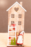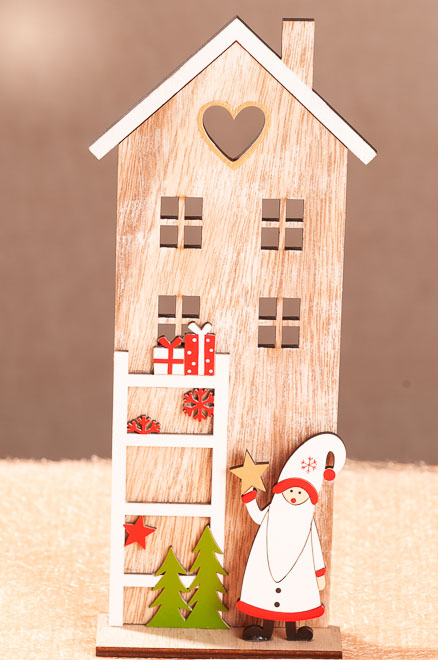 Domeček, dřevěná dekorace jako symbol Vánoc. Před domečkem stojí zimní postavička, která ukazuje zlatou hvězdičku jako přející symbol štěstí. Před domečkem stojí žebřík vedoucí do okna. Na žebříku jsou dárky, vločky a stromeček, tak typické znaky pro vánoční čas. Dekorace vypráví pohádkový příběh plný radosti a štěstí.