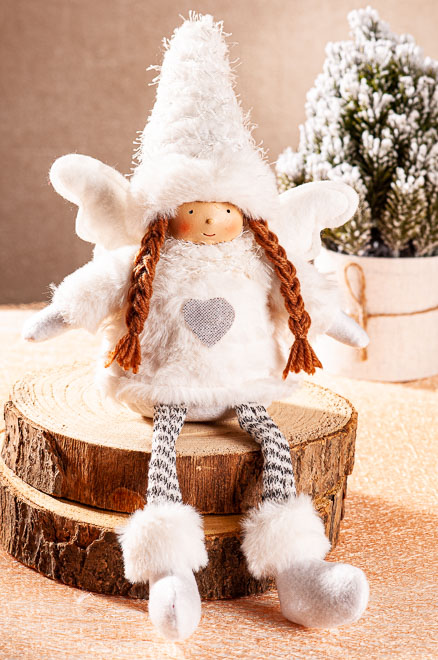 Bílá panenka s křidélky je andílek, který nám připomíná vánoční čas. Panenku si můžete posadit, její nohy jsou "bimbací". Oblečena je do chlupatého bílého kožíšku, na kterém se vyjímá stříbrné srdíčko umístěné na bříšku. Panenka má dva culíky a na hlavě vysokou bílou čepku.